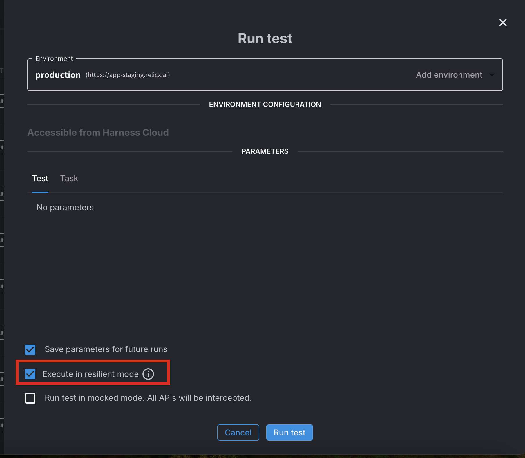 Harness AI Test Automation offers two modes for running tests: fast mode and resilient mode. By default, tests are executed in fast mode, but users have the flexibility to choose resilient mode when running a test. Resilient mode testing enhances the reliability and robustness of your test scripts. This documentation provides an overview of the different aspects of resilient mode testing and offers best practices for achieving more stable and accurate test results.