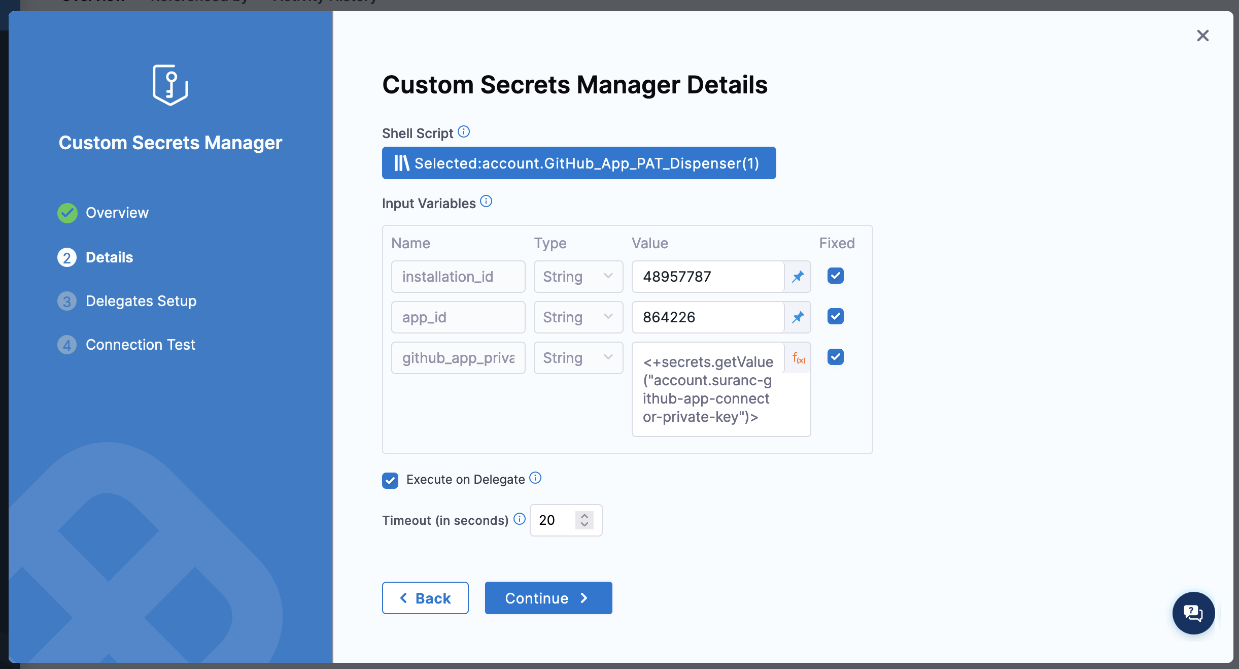 For Secrets Manager, select your GitHub App custom secrets manager connector.
