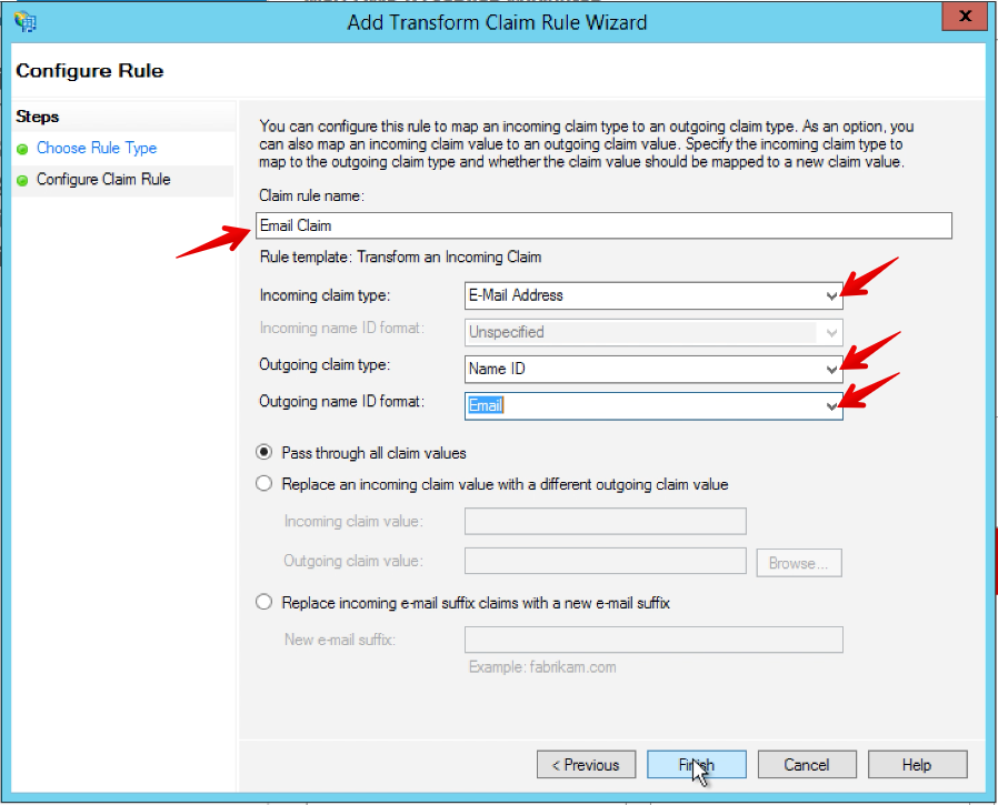 • Set the Incoming claim type as E-Mail Address.