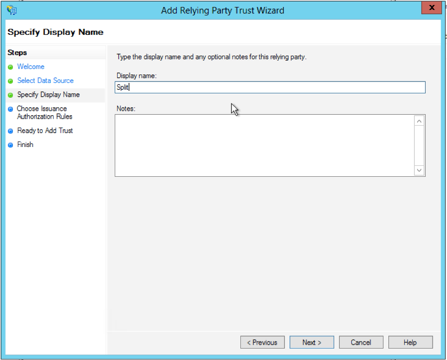6. Provide a display name for the Trust, for example, Split, and then click Next.