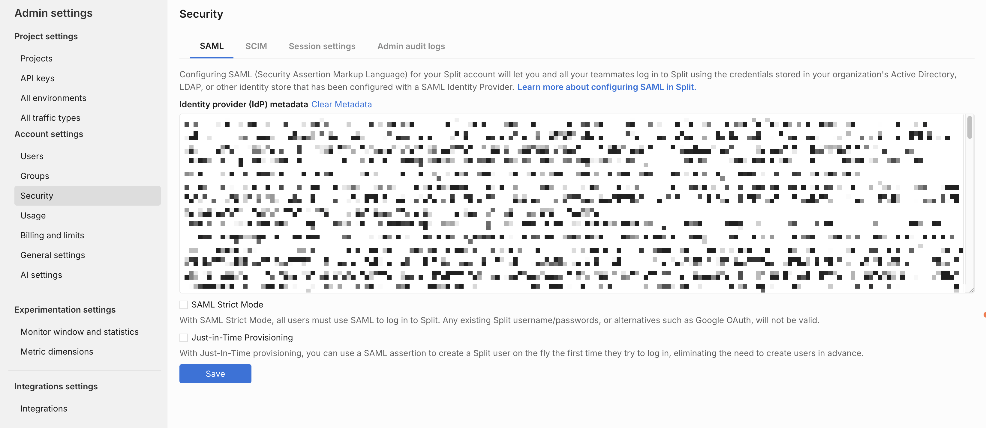 If you are a Split administrator, you can configure SAML in the Security section of Admin Settings.
