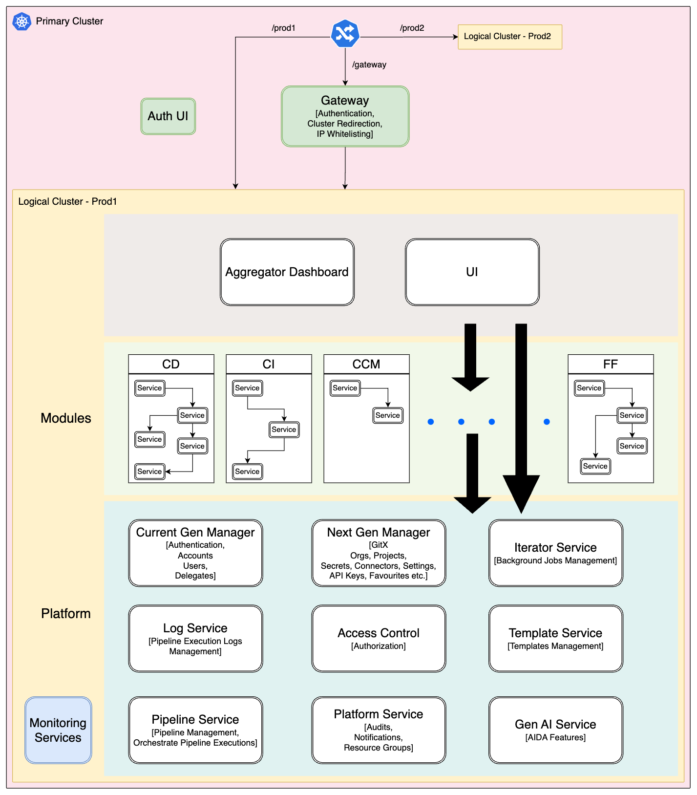 This diagram provides an overview of Harness microservices within the Prod1 logical cluster. This diagram illustrates the microservices architecture of Harness, which can be thought of divided into three distinct layers for simplicity.