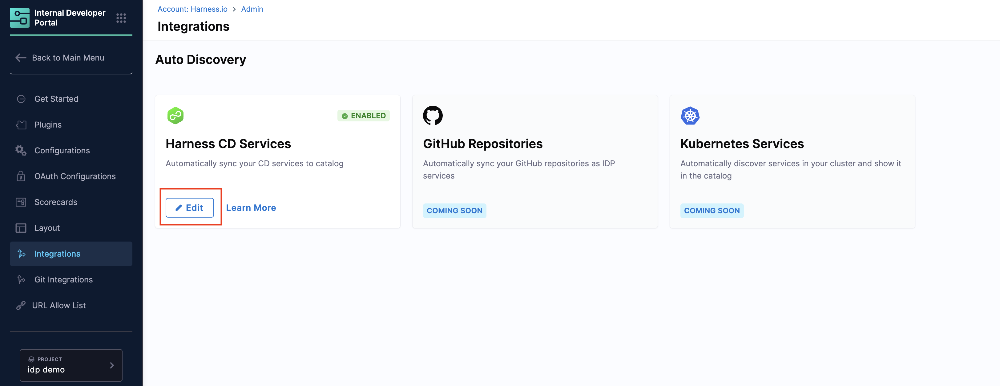 1. Go to ConfigureIntegrationsHarness CD, then select Edit.