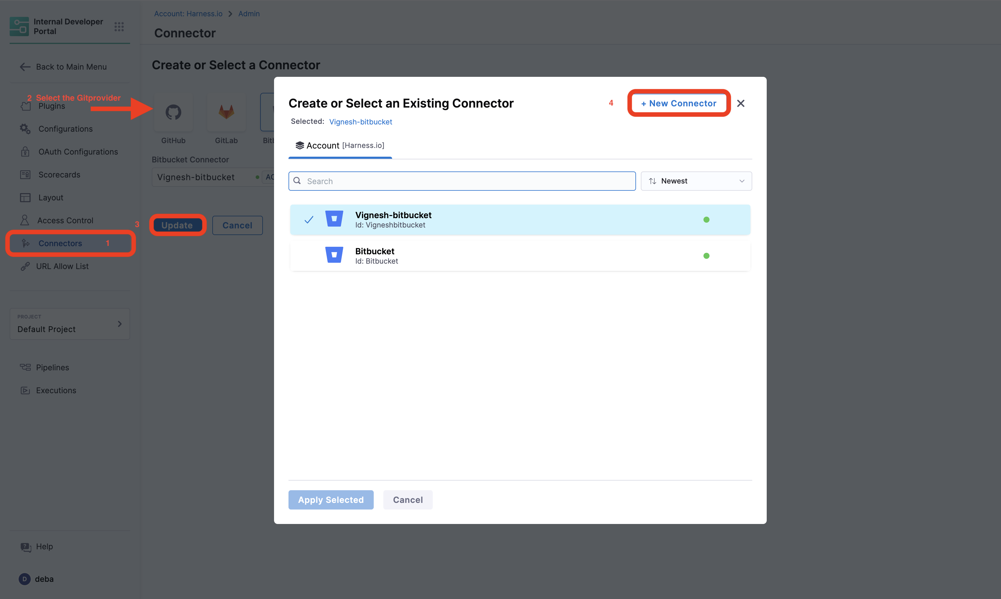 Access to your git provider through the connectors in the Admin section, remember to provide API access. Follow the steps mentioned here to create connector once you're in the connector window.