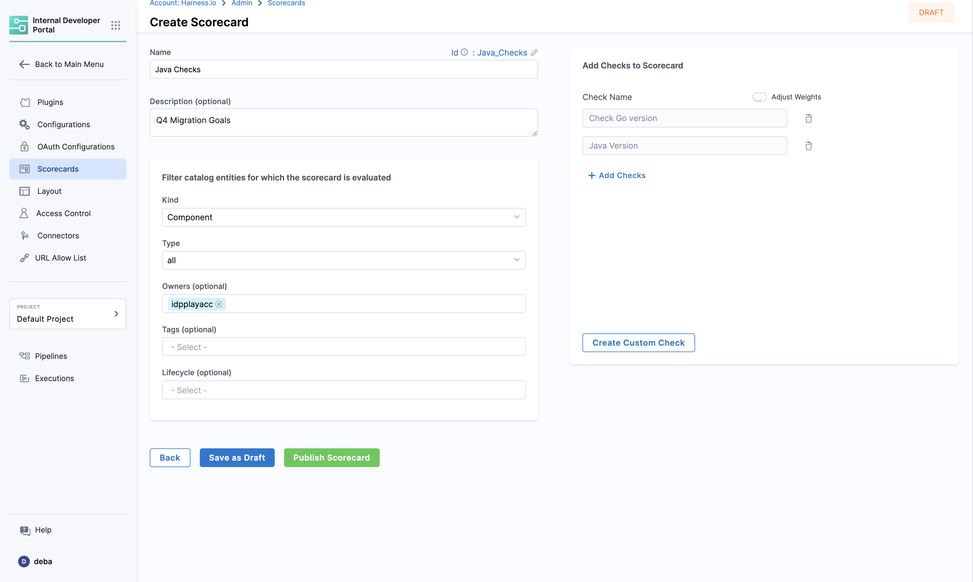 Add Name, Description, Owner (same as that of the software component you want to add this scorecard to) and select the Checks you created above to track the migration and publish the Scorecard.