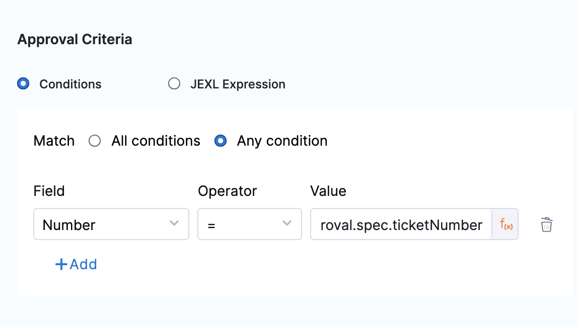 In Conditions, you can use the ServiceNow ticket related fields to define approval criteria. Four supported operators are =, !=, in, and not in.
