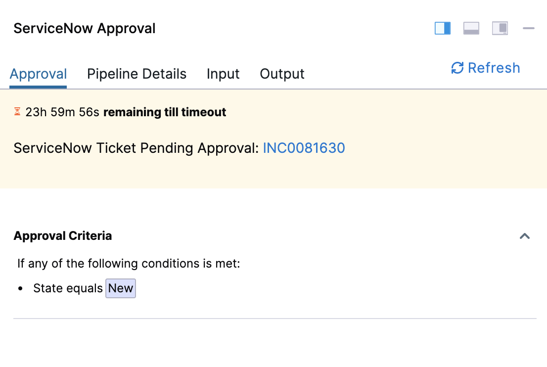 When the step is waiting for a response from ServiceNow, you can use the Refresh button to immediately fetch the latest status of the approval ticket instead of waiting for the polling interval.