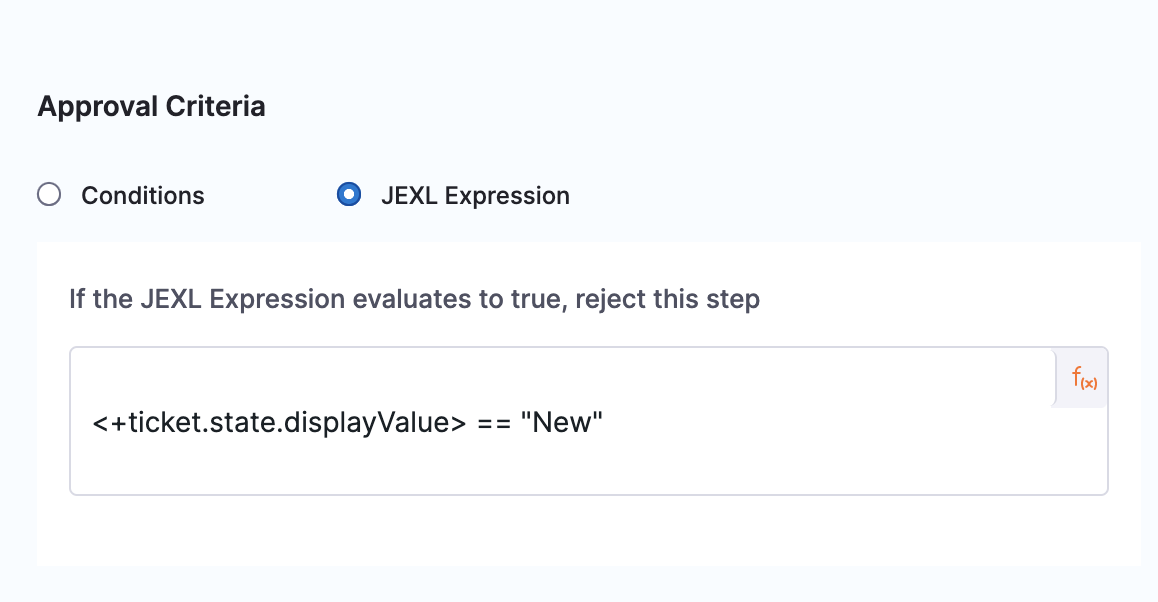 For example, <+ticket.state.displayValue> == "New" in the Approval Criteria, JEXL Expression checks to see if the status of the ticket is New.