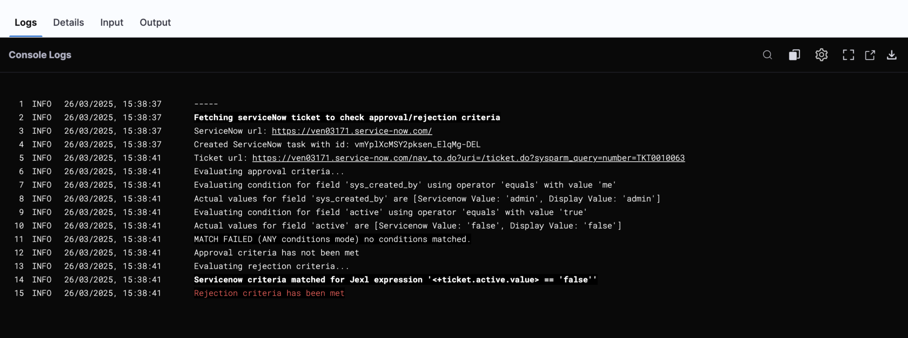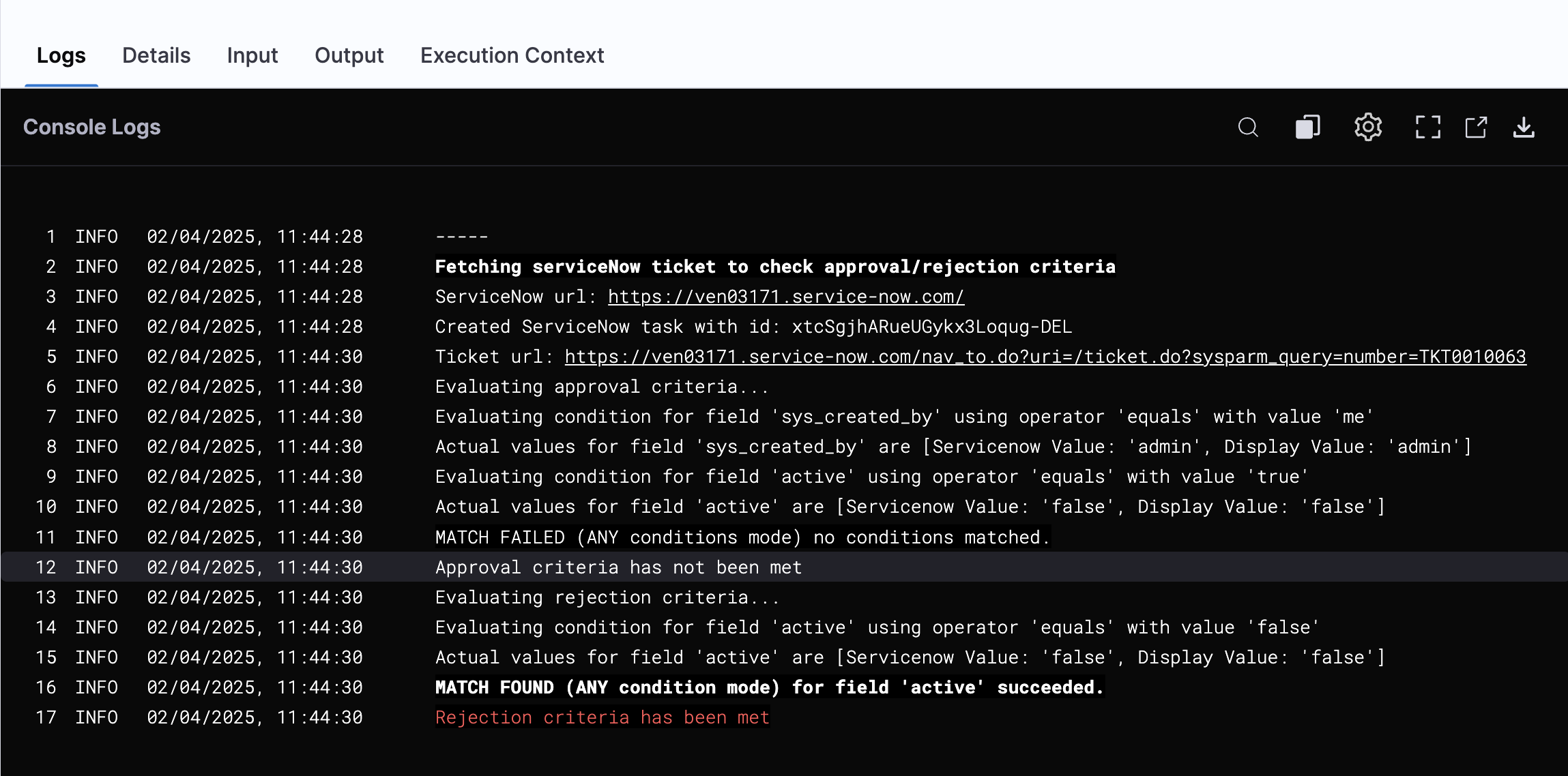 You can also view detailed logs that describe why the validation failed or succeeded in the ServiceNow approval step.