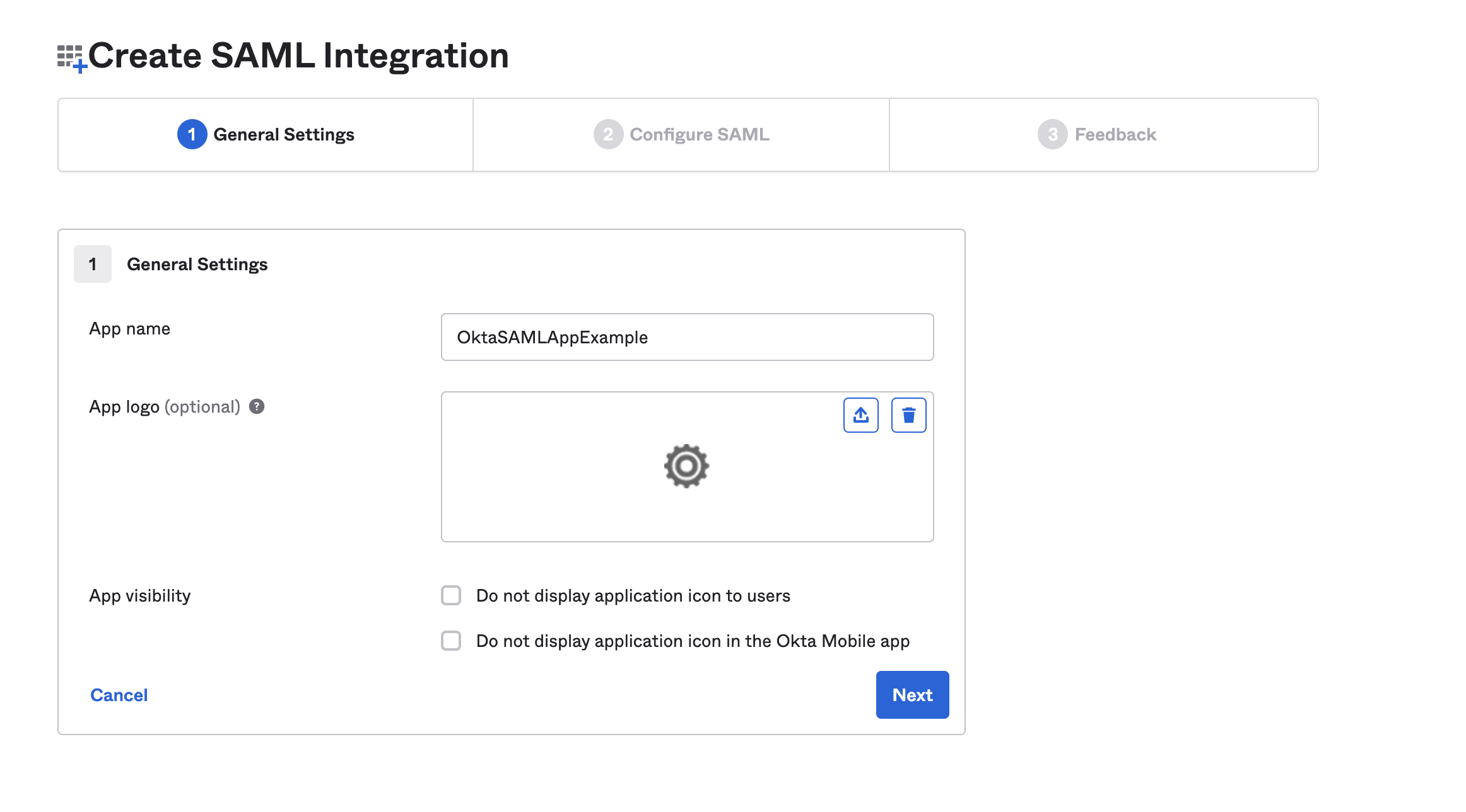 3. Enter a Name for the SAML configuration, and select Okta.