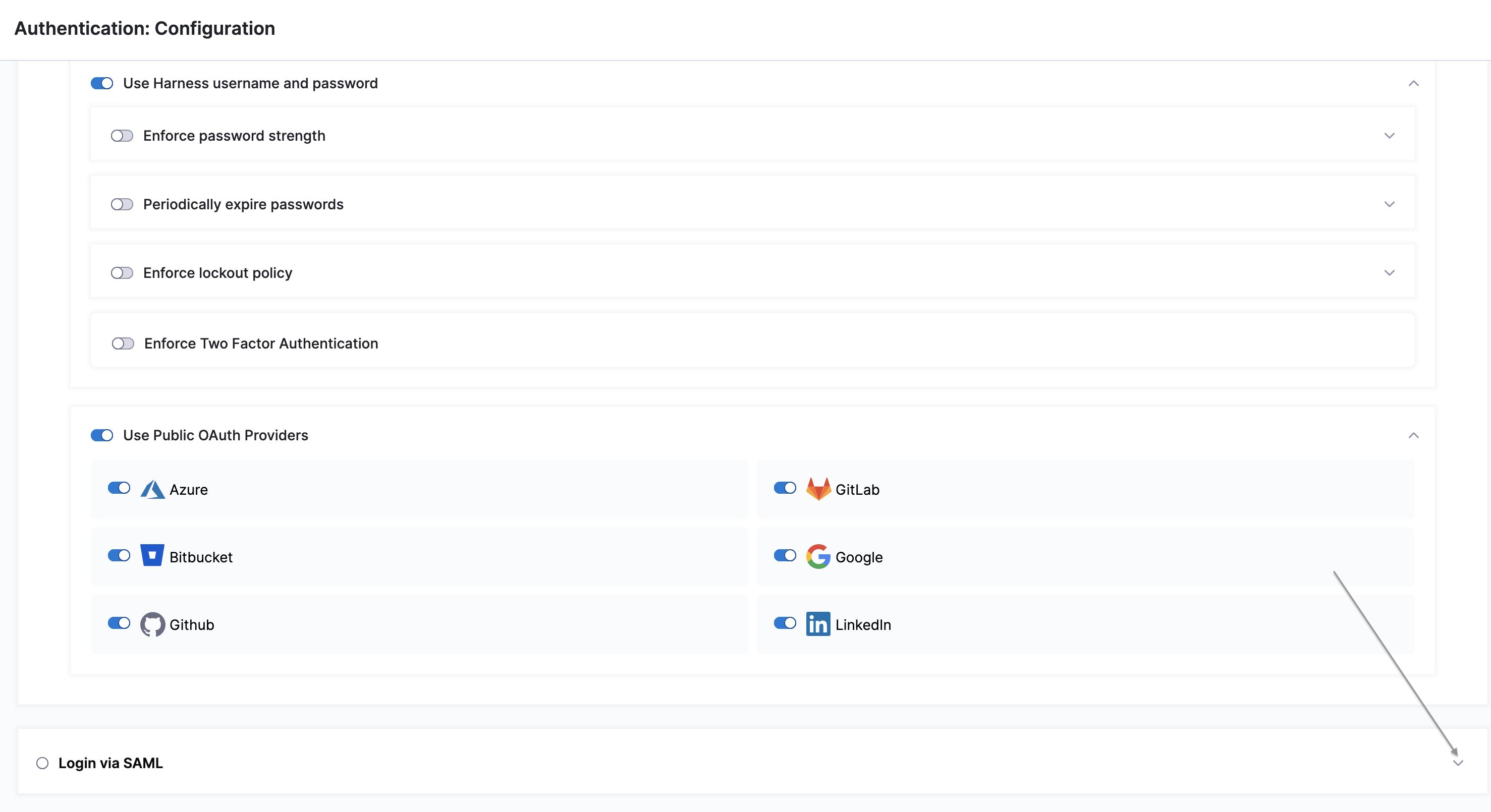 To prevent lockouts or in the event of OAuth downtime, a user that has Account Admin assigned on All Account Level Resources or All Resources Including Child Scopes can use the Local login URL https://app.harness.io/auth/#/local-login to sign in and update the OAuth settings.