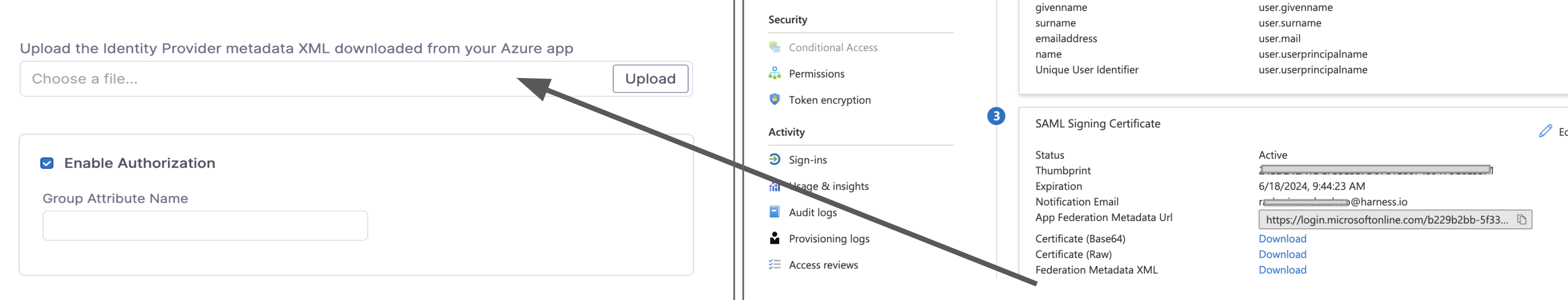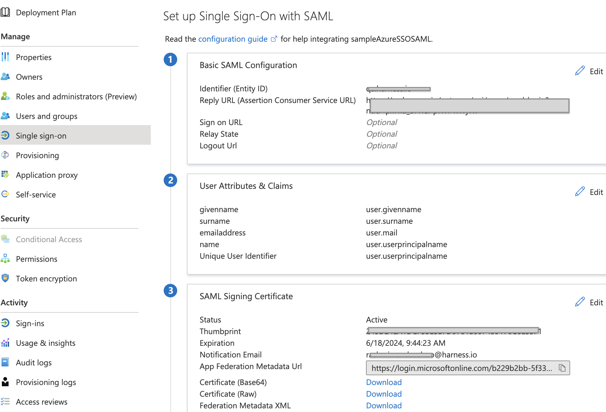 • SAML metadata file: This file is provided by your SAML provider app. You upload this file into the Harness Single Sign-On (SSO) Provider dialog to integrate the app with Harness.