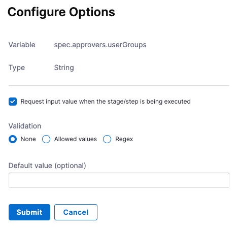- Your pipeline includes an Approval step, and you want to specify the approval groups when the Approval step runs.