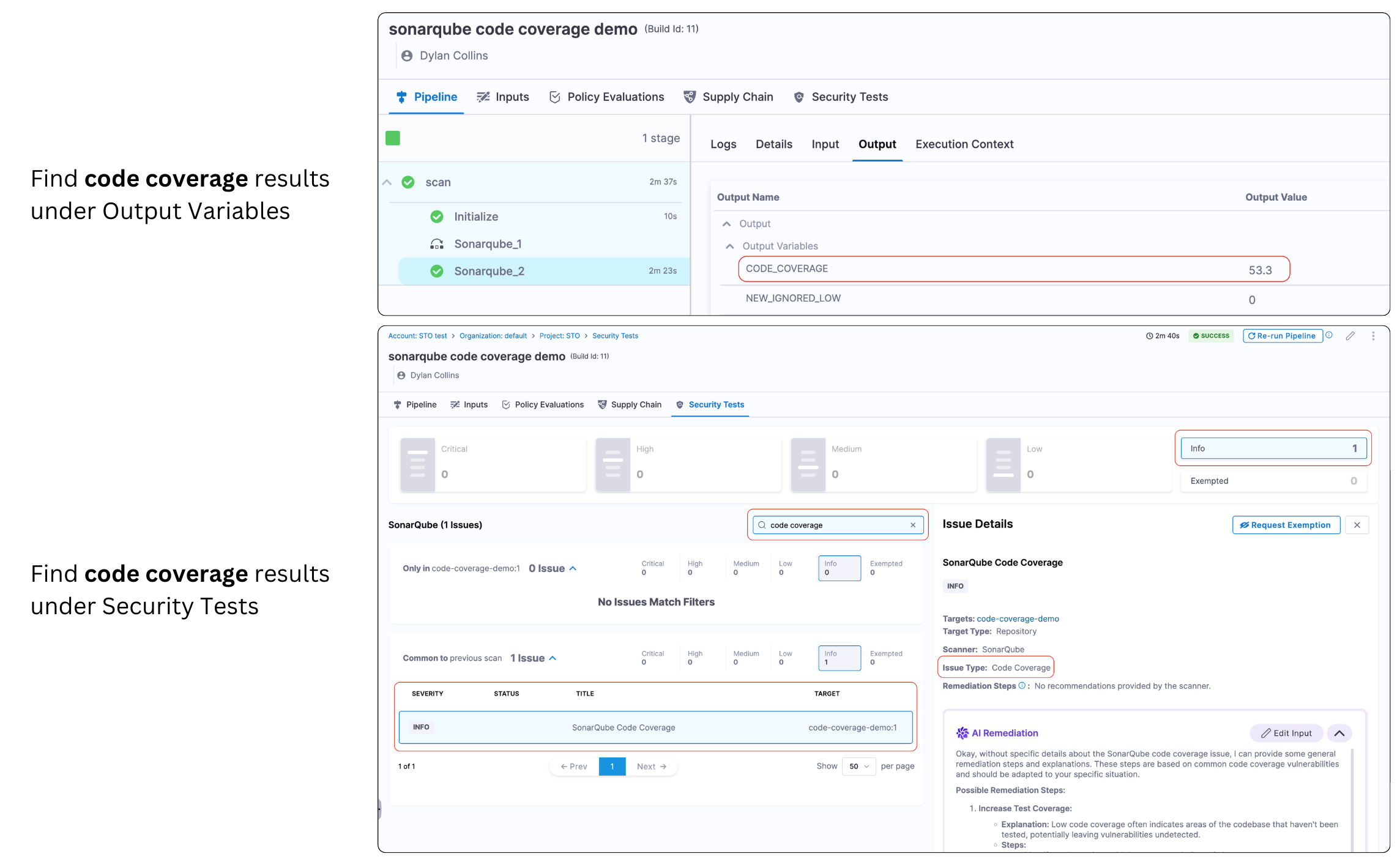 Code CoverageImported as both a step output variable and a policy issue with Info severity.