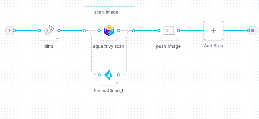 In this example, the stage scans an image target using Aqua Trivy and Prisma Cloud. The two steps run in parallel within a step group.