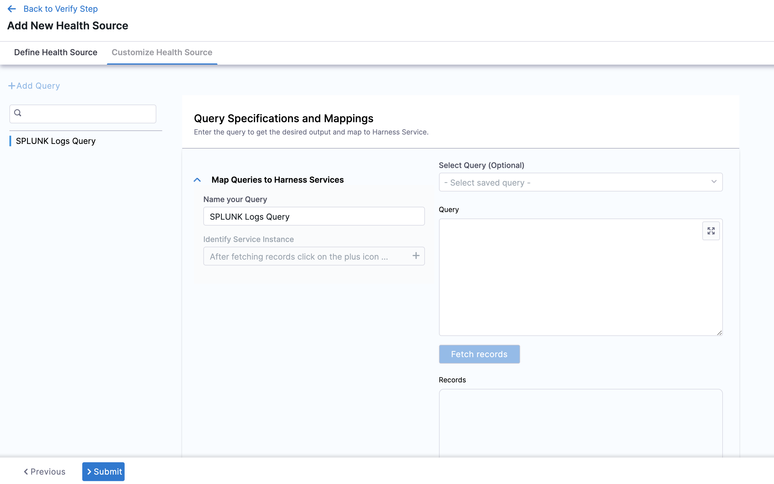 Click Next. The Customize Health Source settings appear. The subsequent settings in Customize Health Source depend on the Health Source Type you selected. You can customize the metrics to map the Harness Service to the monitored environment in Query Specifications and Mapping settings.