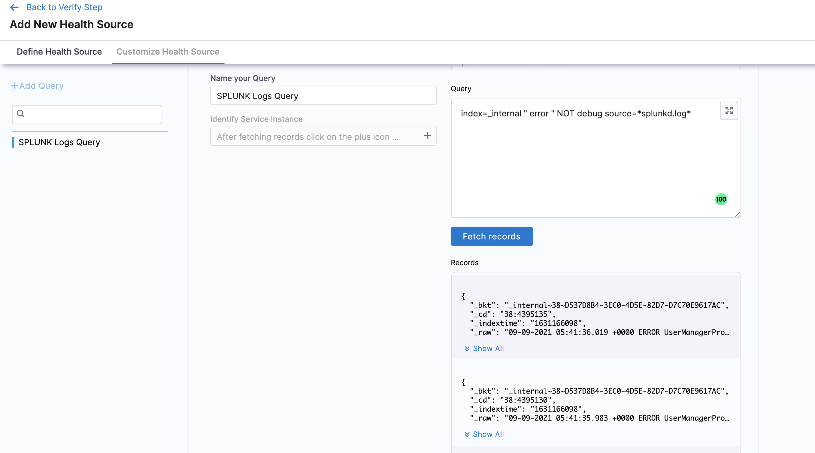 Click Submit. The Splunk health source gets added to the monitored service.
