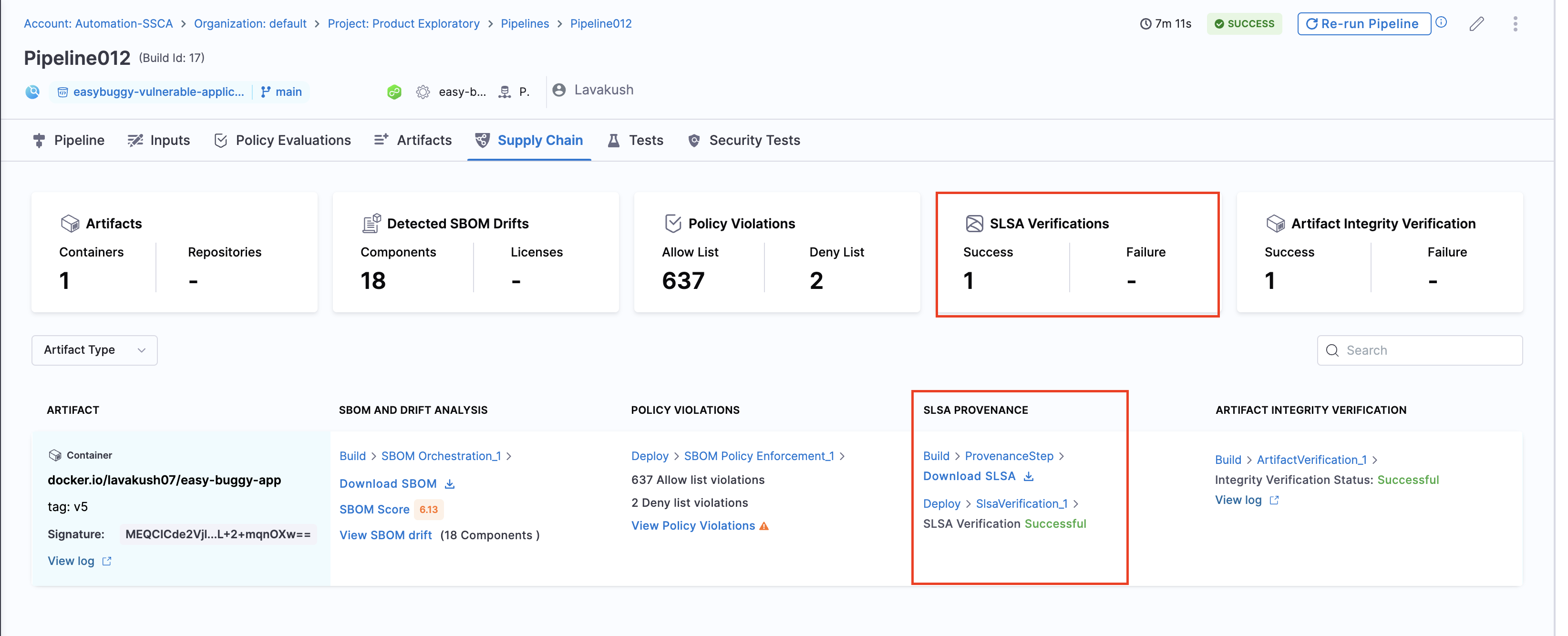 The signed attestation is stored, as a .att file, in the artifact repository along with the image. You can also find the SLSA Provenance on the Supply Chain tab on the Pipeline Execution details page in Harness.You can download your SLSA provenance and find the status of the SLSA verification step. The overview section presents a cumulative count of all Success and failure cases.