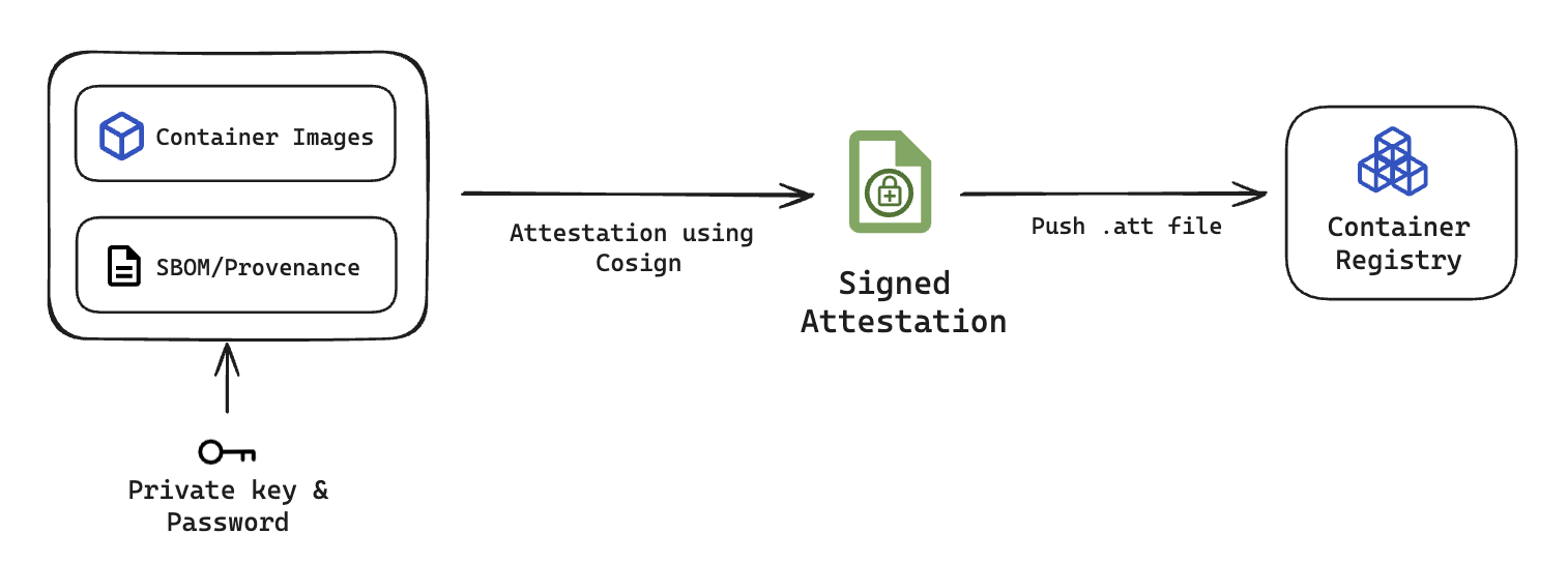 • Attestation provides cryptographic proof of an artifact’s origin based on how and where it was created. It captures metadata about the build environment and verifies the artifact’s integrity before it is signed. Attestation serves as a trusted statement regarding the artifact’s provenance and the conditions under which it was produced.