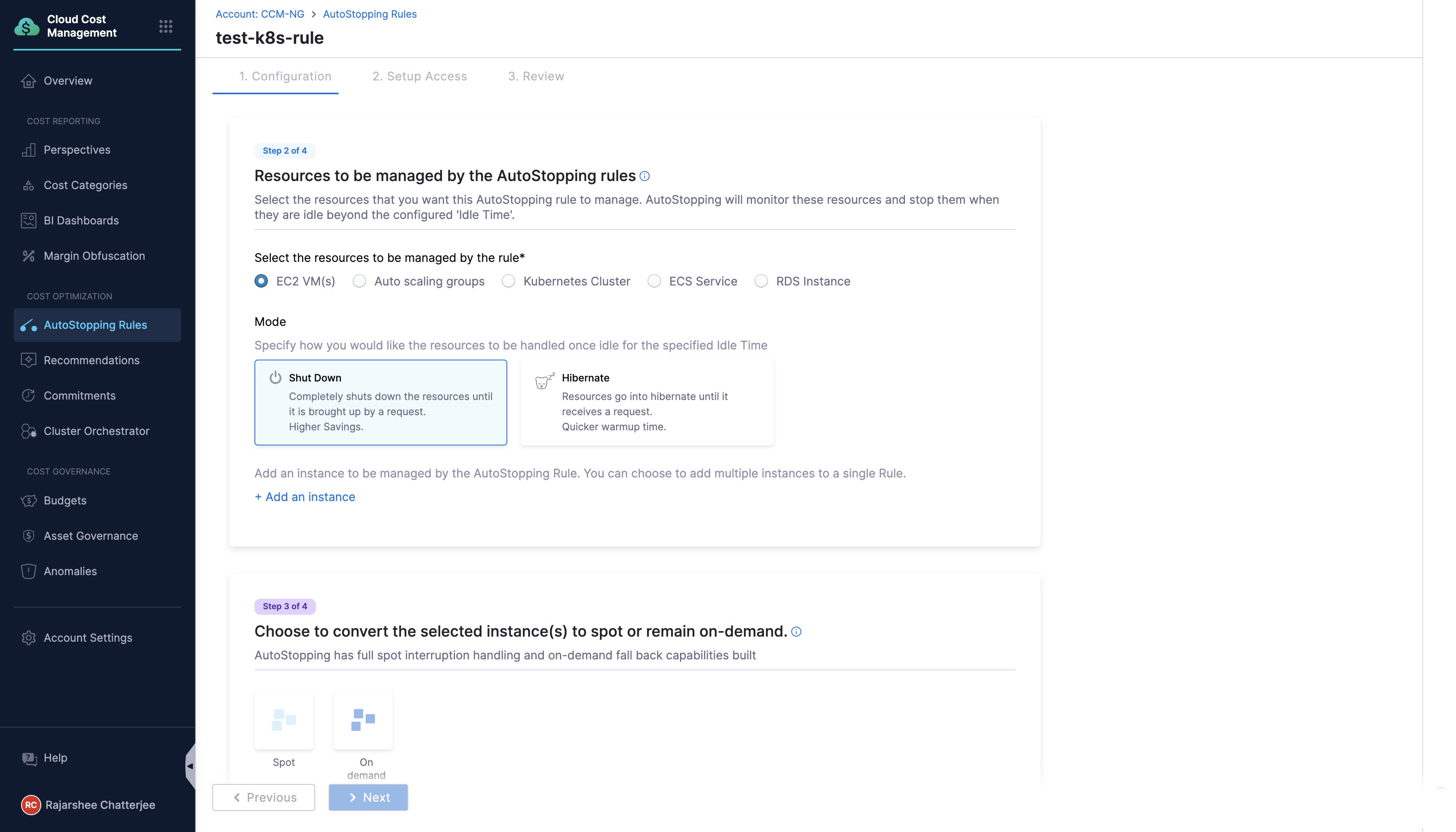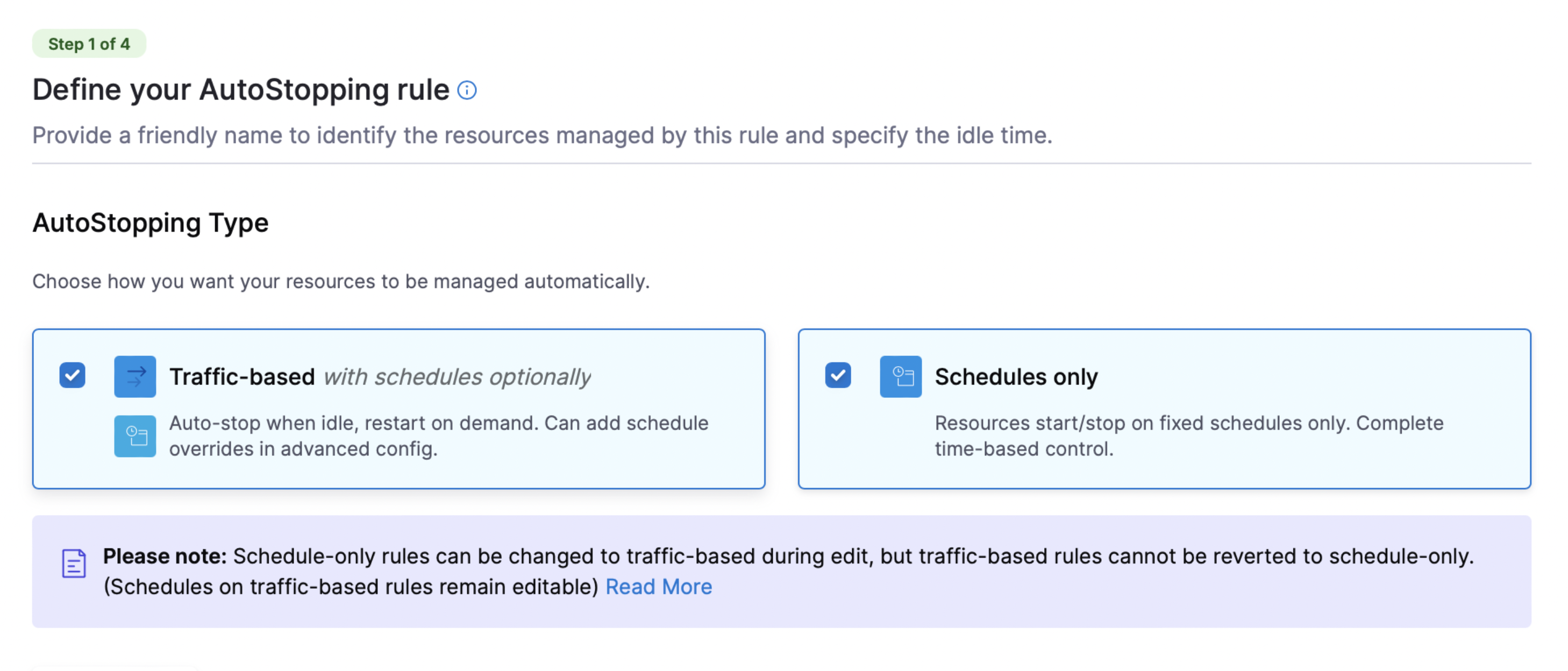 - Streamlined Autostopping Rule Creation: CCM has introduced a use case-based setup with intuitive Traffic-based and Schedule-based mode selection. The interface dynamically adjusts to display only relevant configuration fields, simplifying the setup process and improving user experience. [CCM-24600]