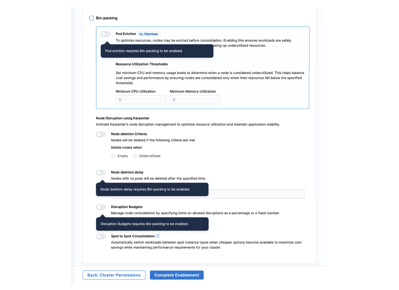 Disable Functionality: Added support for disabling Cluster Orchestrator on enabled clusters. Disabling a Cluster Orchestrator stops all its components, removes finalizers and configurations, disables Harness-managed nodepools, and prepares the cluster for Karpenter (or any autoscaler) fallback. [CCM-25739]
